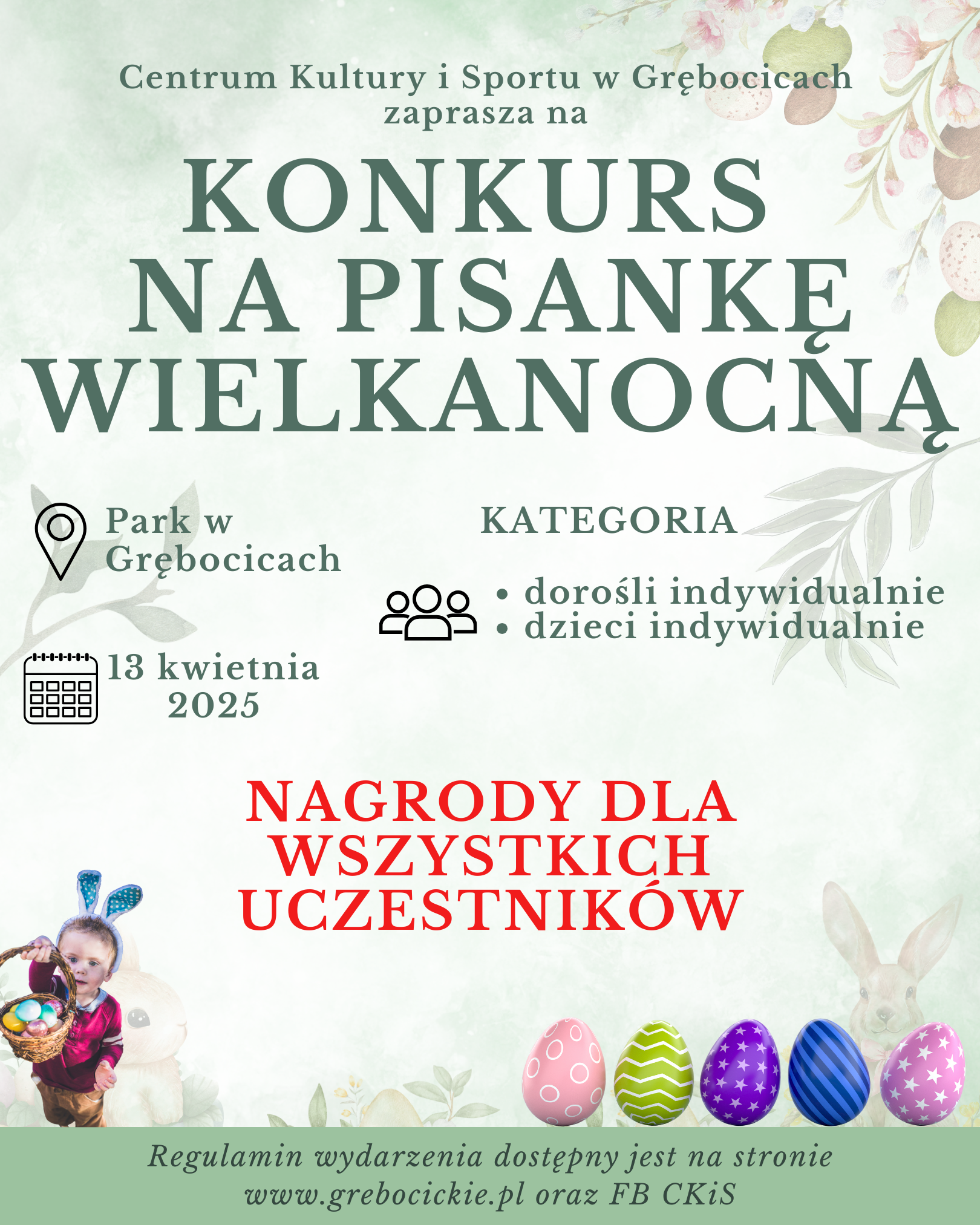 Konkurs na Pisankę Wielkanocną to wydarzenie promujące tradycje świąteczne oraz rozwijające kreatywność mieszkańców Gminy Grębocice. Uczestnicy przygotowują własnoręcznie zdobione pisanki – technika i styl wykonania są dowolne, jednak mile widziane są motywy nawiązujące do tradycji.