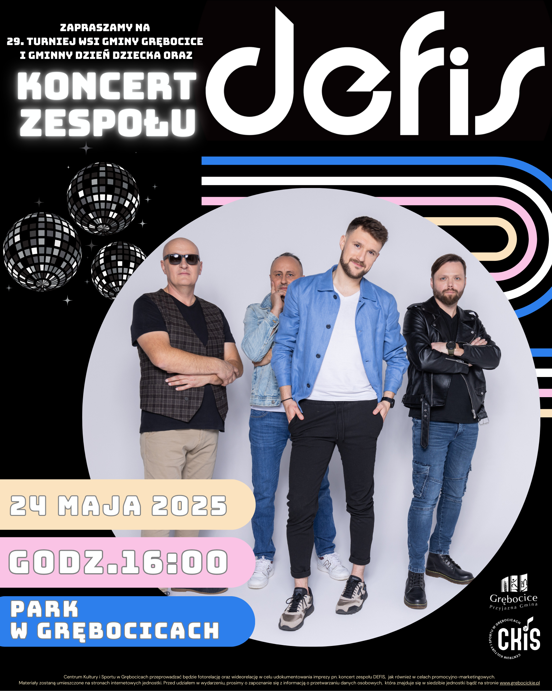 Już 24 maja 2025 zapraszamy do parku w Grębocicach na wyjątkowy koncert zespołu Defis – energetyczne brzmienia, taneczna atmosfera i niezapomniane emocje gwarantowane! Wydarzenie odbędzie się w ramach 29. Turnieju Wsi Gminy Grębocice oraz Gminnego Dnia Dziecka, więc czeka nas dzień pełen radości, integracji i świetnej zabawy dla całych rodzin.