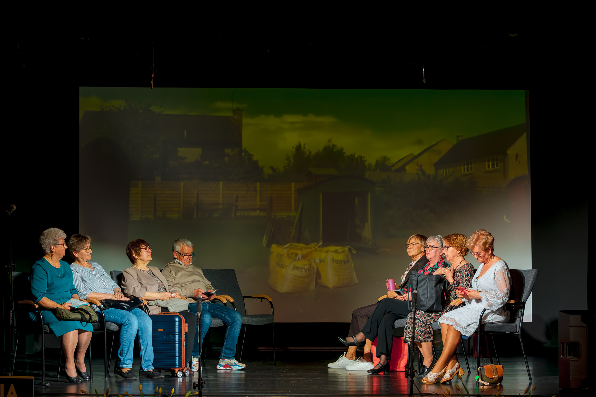 Scena ze spektaklu. Dwie grupy osób siedzą na krzesłach naprzeciwko siebie. Pośrodku, na ekranie w tle, wyświetlane jest zdjęcie wiejskiego podwórka z żółtymi workami. Aktorzy są ubrani w codzienne stroje, obok jednej z kobiet stoi niebieska walizka.