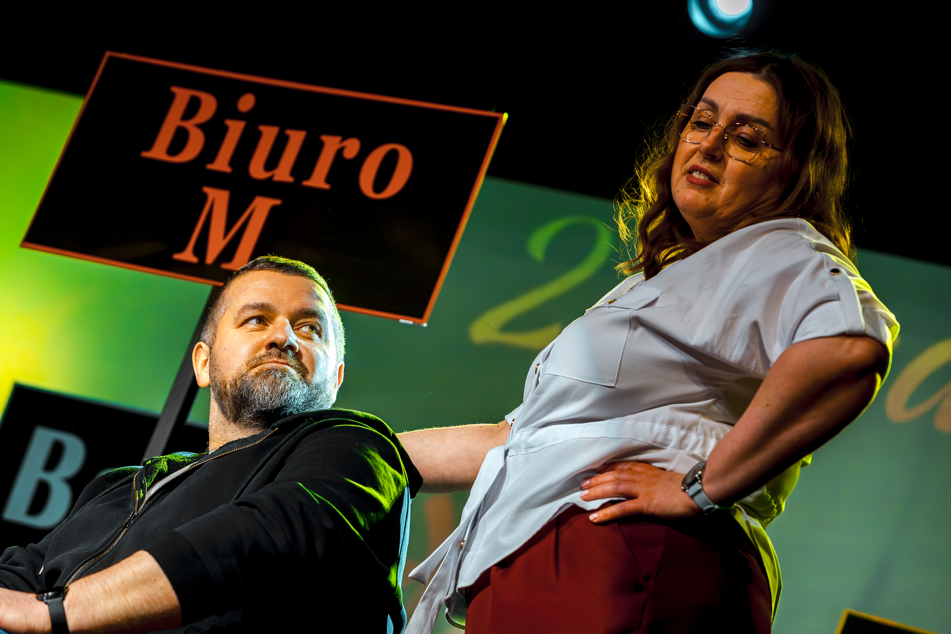 Portret dwójki aktorów na scenie. Widok z dołu. Mężczyzna z brodą patrzy w górę, a stojąca obok niego kobieta w okularach i jasnej koszuli trzyma się pod boki, patrząc na niego z góry. W tle widoczny fragment napisu „Biuro M.”.