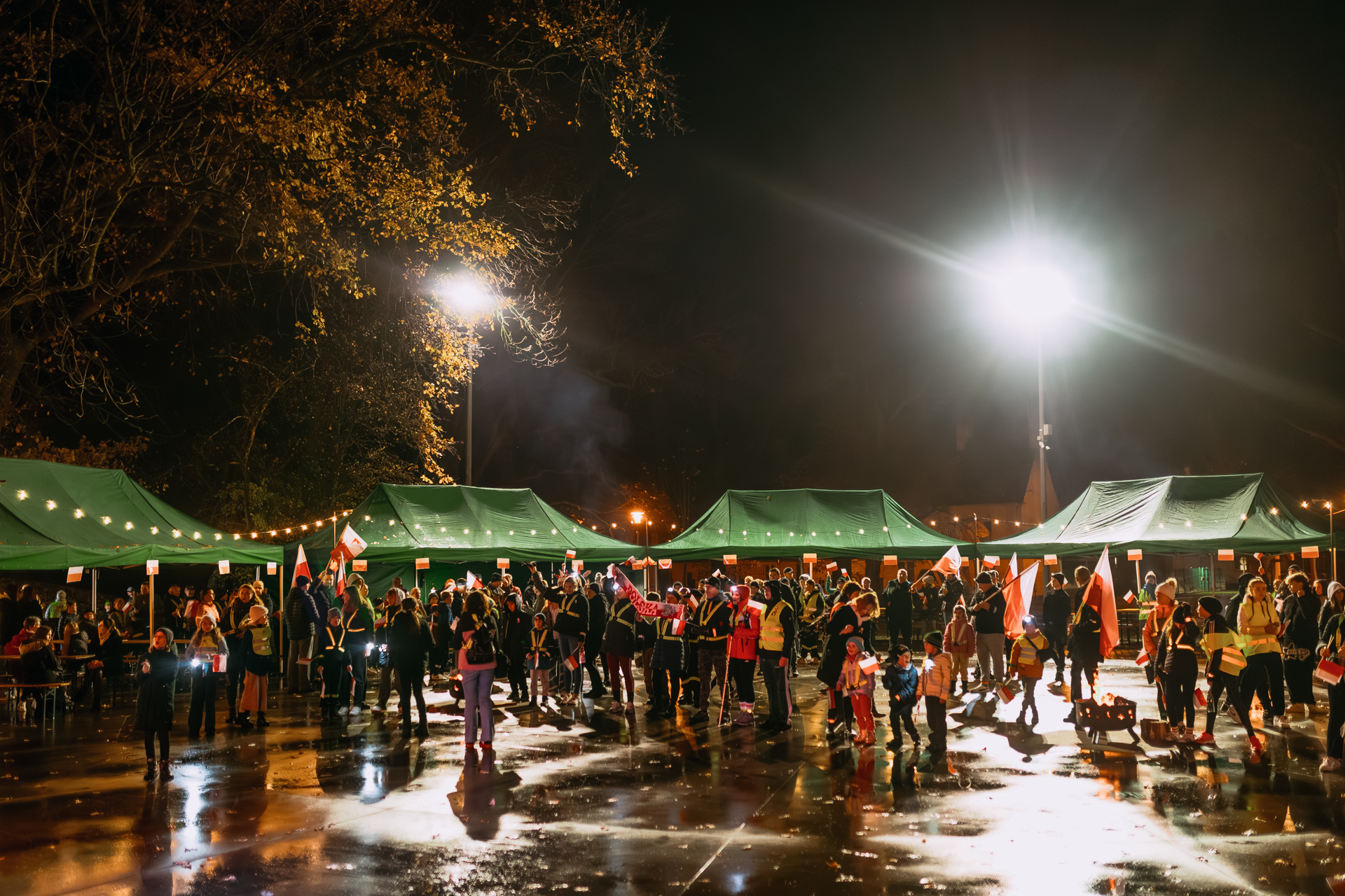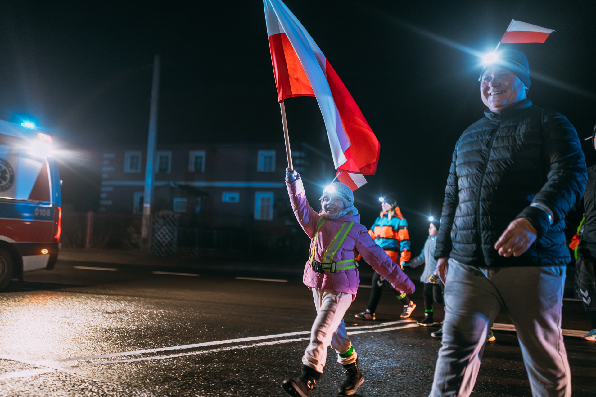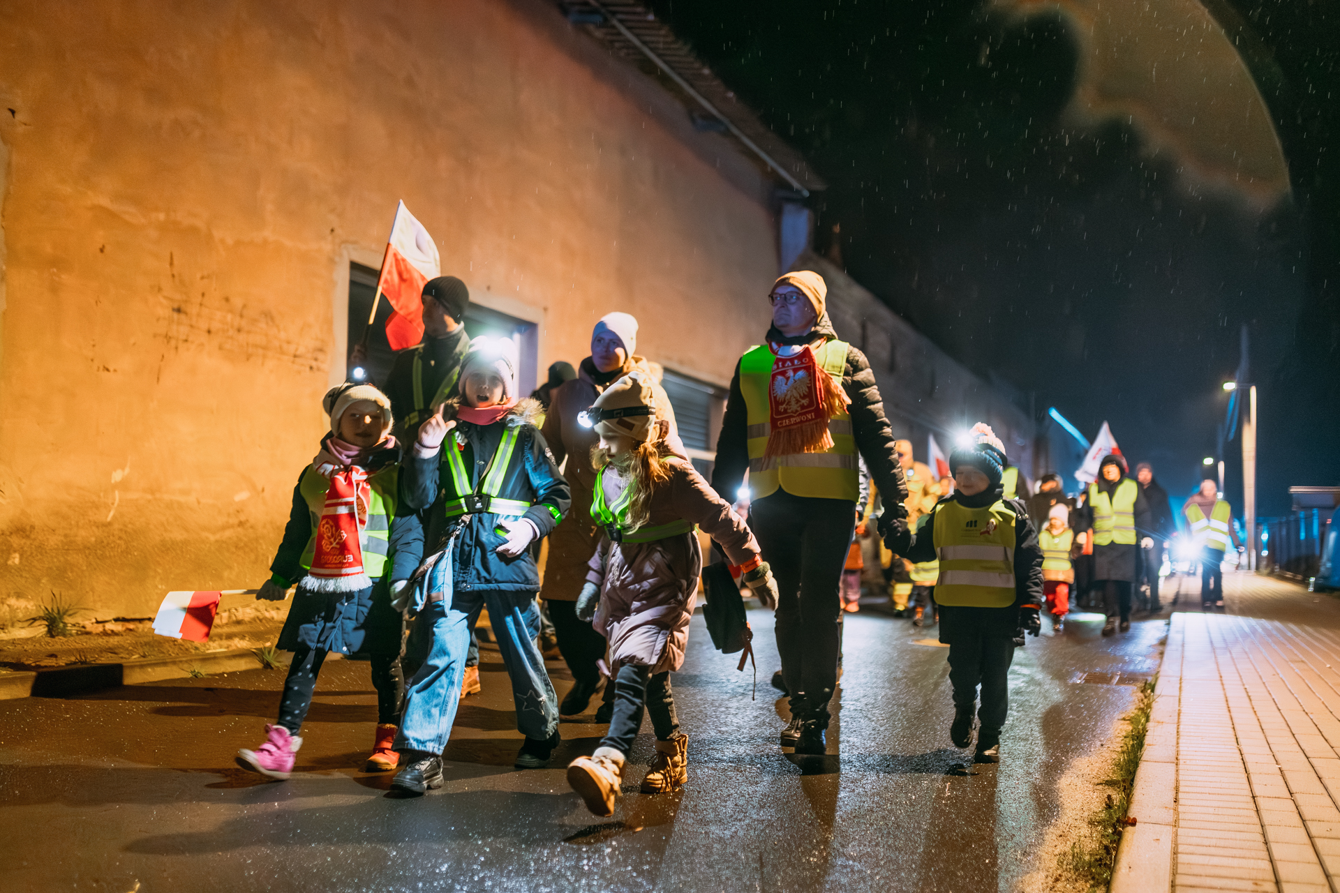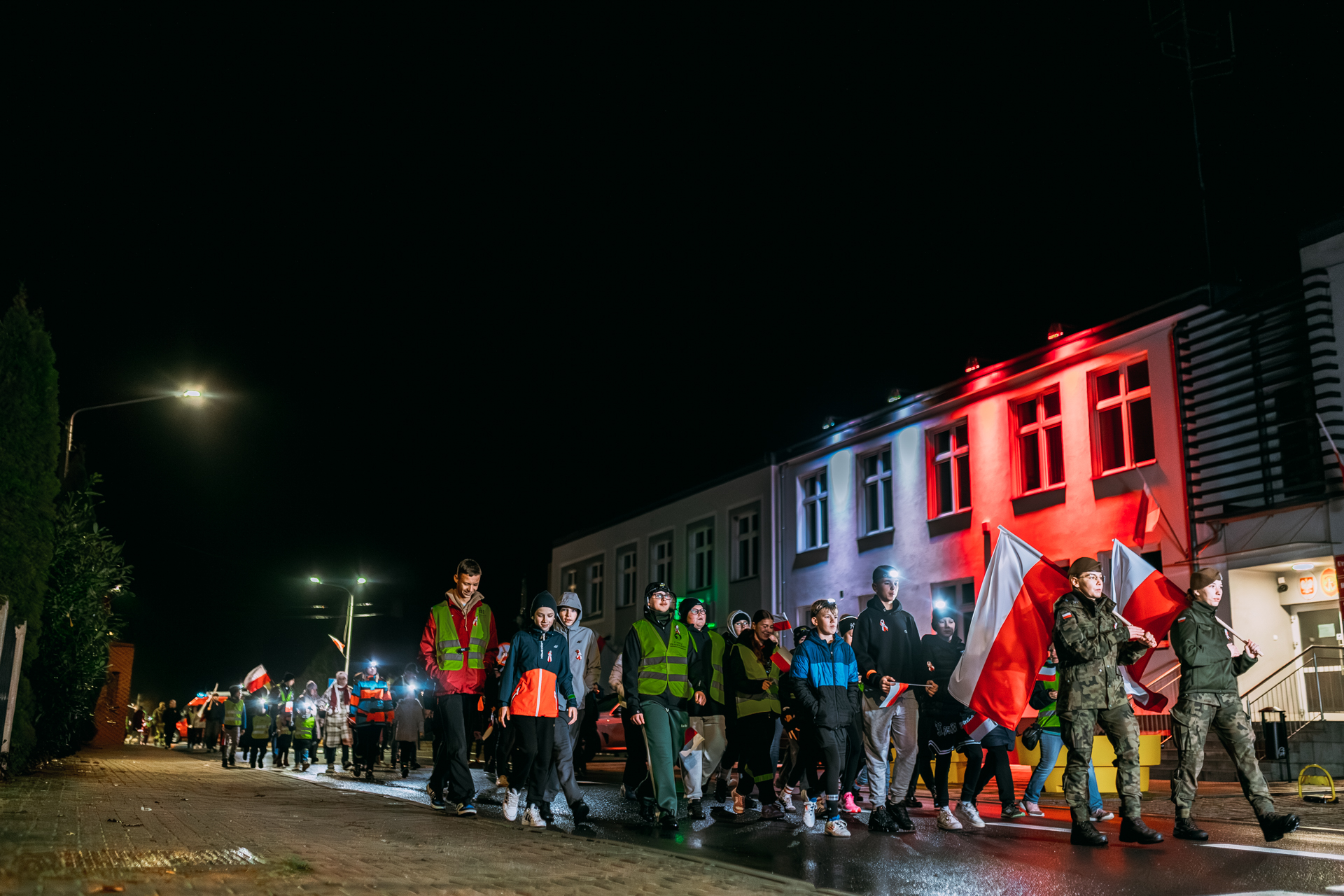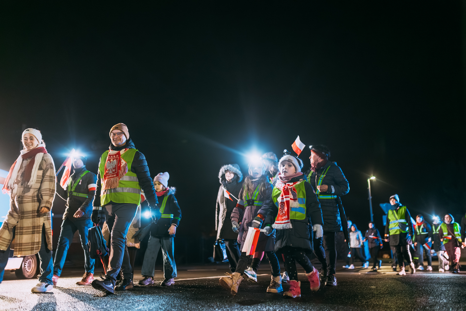 Punktualnie o 18:00 uczestnicy wyruszyli , pokonując trasę o długości 4 km i 400 metrów. Wędrówka odbyła się w klimacie skupienia, ale także radości ze wspólnego, międzypokoleniowego świętowania. Po dotarciu na metę, odbyło się uroczyste odśpiewanie hymnu narodowego i wciągnięcie flagi na maszt. Następnie odbył się konkurs ,,O Niepodległej”, w którym można było wygrać atrakcyjne nagrody min. hulajnogę elektryczną, plecaki,słuchawki . W między czasie można było wypić ciepłą herbatę, zjeść patriotyczne ciastko i gorącą kiełbasę z bułką.