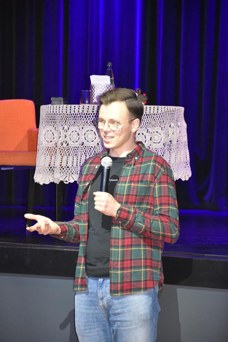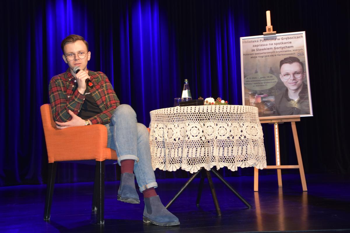 We wtorek dziewiątego grudnia gościliśmy w Grębocicach niezwykle sympatycznego, skromnego, utalentowanego (zarówno w piśmie jak i mowie), pisarza bestsellerowej serii kryminałów, której fabuła osadzona jest w Karkonoszach – Sławka Gortycha. Spotkanie przebiegło w wyjątkowo przyjemnej atmosferze. Uczestnicy mieli okazję wysłuchać kilku ciekawych, a zarazem zabawnych anegdot z życia autora. Pan Sławek opowiedział również, skąd czerpie inspiracje do tworzenia kolejnych tomów oraz uchylił rąbka tajemnicy dotyczącej swoich przyszłych planów.