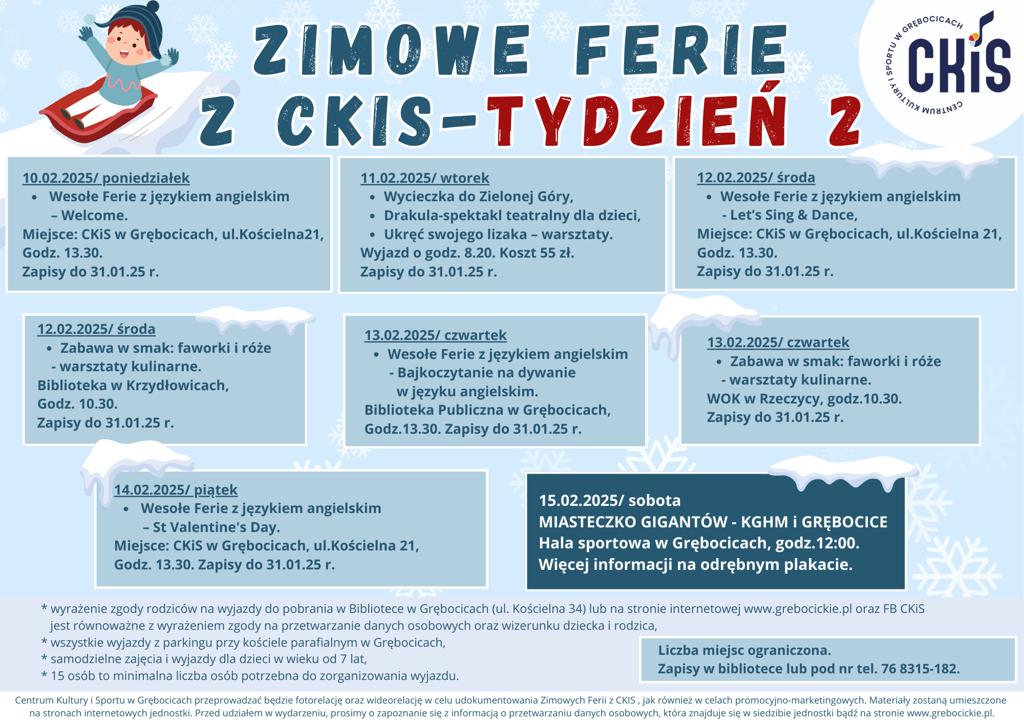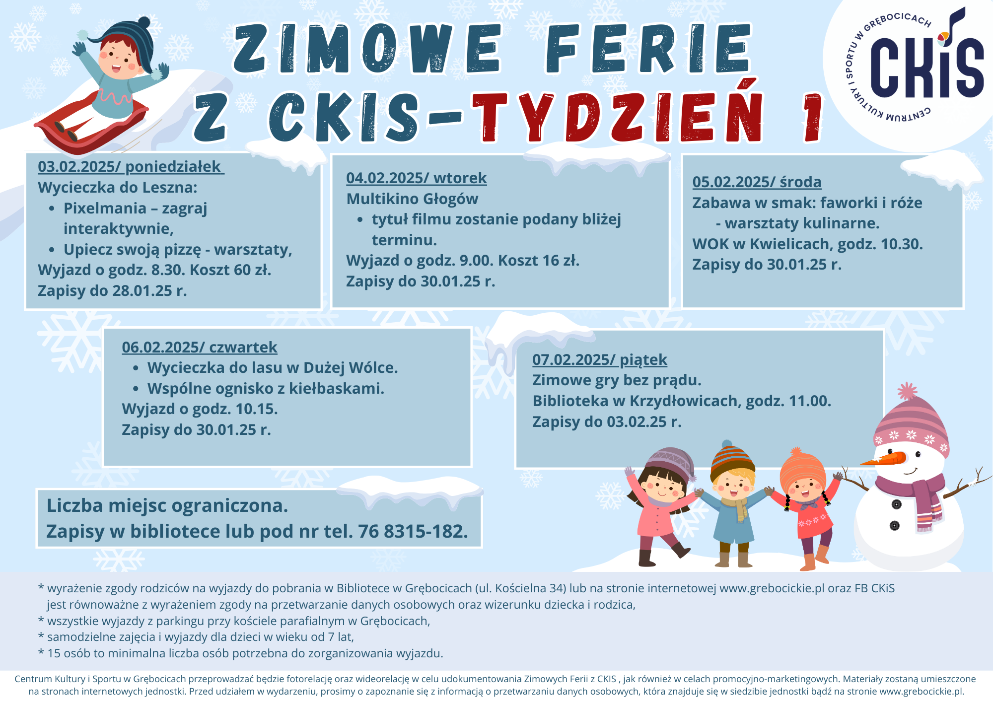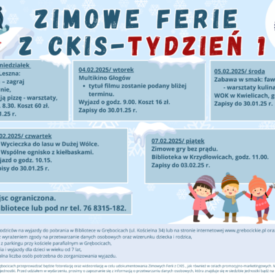 Zapraszamy na Ferie Zimowe z CKiS Grębocice! Rafał Jaworski2025-01-17T17:58:21+01:0017 stycznia 2025|Aktualności| Czeka na Was mnóstwo atrakcji, świetna zabawa i niezapomniane chwile! Nie przegapcie okazji, by spędzić ferie aktywnie i kreatywnie! Dołączcie do nas i przeżyjcie wyjątkowe ferie! Kliknij tutaj – ZAPIS DO PLAKATU https://grebocickie.pl/wp-content/uploads/2025/01/Ferie-zimowe.mp3 Udostępnij ten artykuł! FacebookTwitterLinkedInWhatsAppEmail